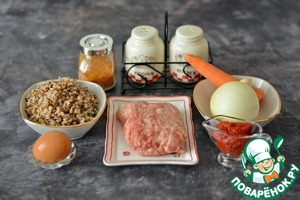 Подготовьте необходимые продукты для приготовления гречаников в томатном соусе. Очистите и сполосните лук, морковь и зубчик чеснока.