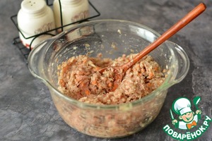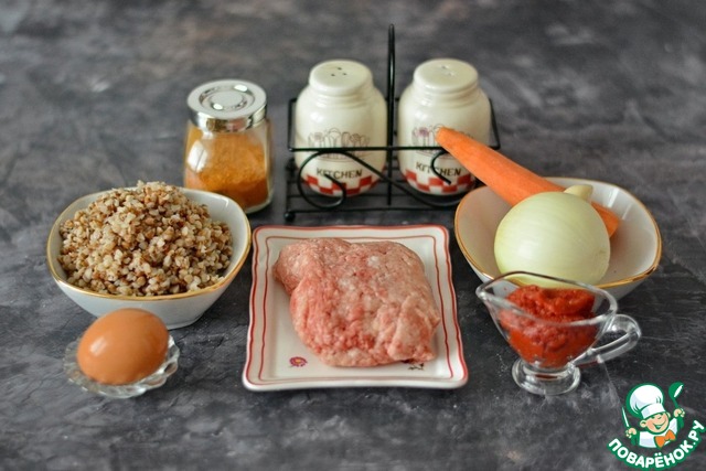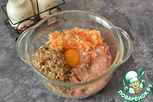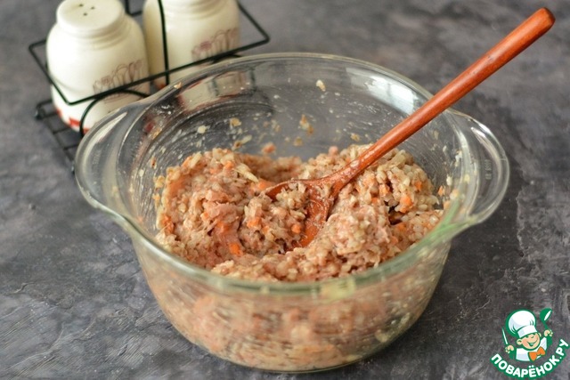 Лук, морковь и чеснок измельчите в блендере. К фаршу добавьте измельчённые овощи, варёную гречку, сырое яйцо, посолите и поперчите по вкусу