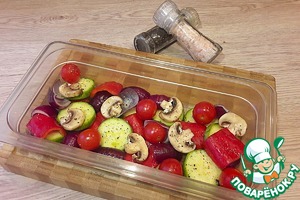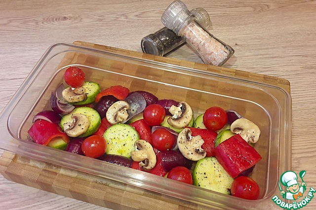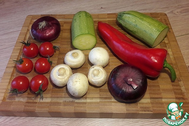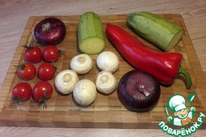 Кабачок режем на 1 /2 дольки, грибы на половинки, перец квадратиками, лук дольками
