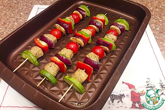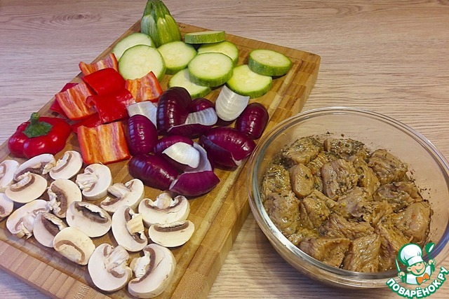 Нанизываем на шпажки мясо с овощами - чередуя их.