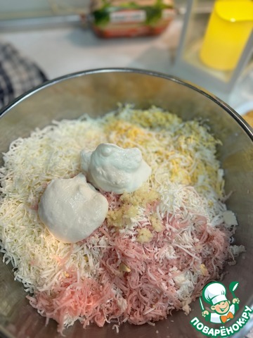 - Сметана (Можно добавить и больше. Смотрите по консистенции начинки. Она не должна быть жидкой. Сметану можно заменить майонезом.) — 3 ст. л.
