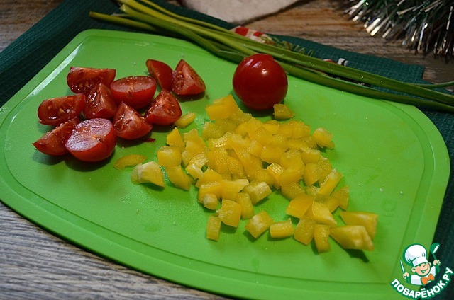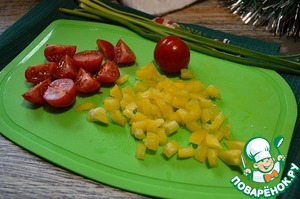 Овощи вымыть, обсушить, нарезать перец - кубиком, помидоры - четвертинками. Слегка посолить.