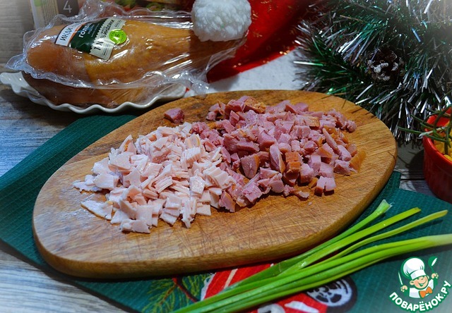Так же кубиком нарезать копчёную голень и ветчину.