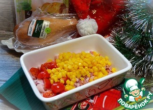 В салатнике смешать мясные продукты, овощи и кукурузу.