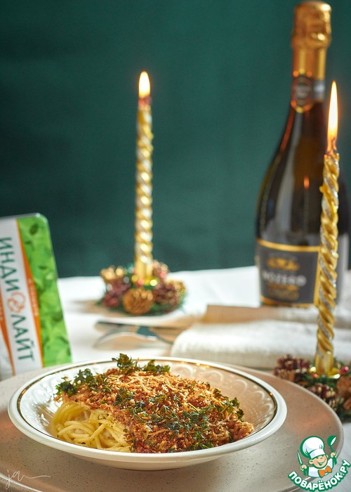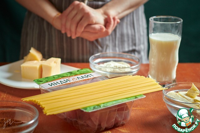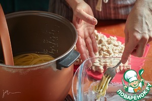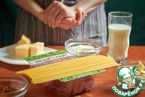 Подготовить необходимые ингредиенты. Макароны можно использовать любые. Я выбрала спагетти. Но можно взять даже рожки, ракушки, яичную лапшу. Пасту отварить до полуготовности. Как это? От рекомендованного для приготовления времени отнять две минуты.