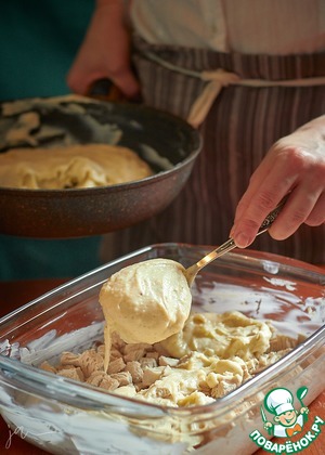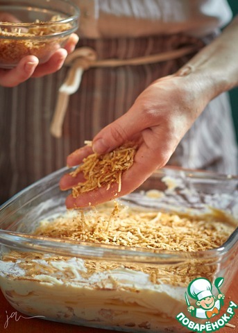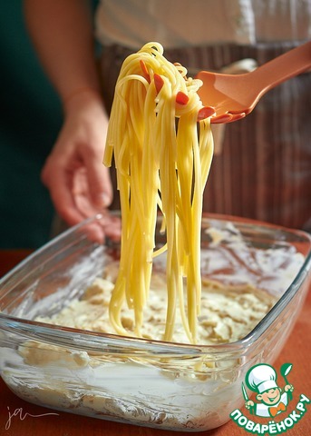 Добавить макароны, разровнять, выложить вторую половину соуса.
