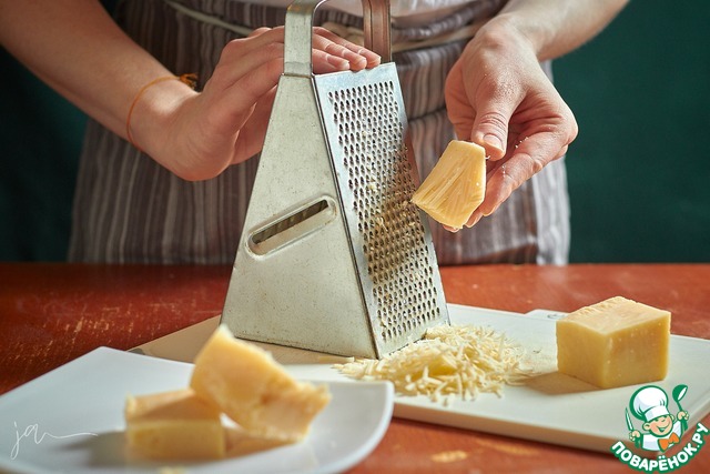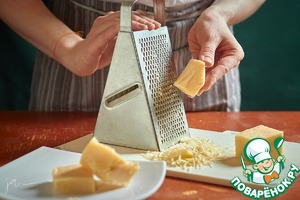 Пармезан натереть на мелкой терке. Смешать с панировочными сухарями.