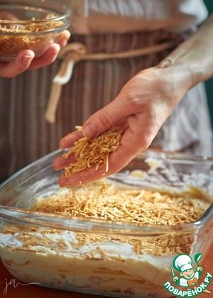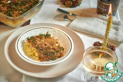 Посыпать смесью тетраццини. Запекать в духовке при температуре 180С в течение 20 минут. Посыпать мелко нарубленной петрушкой.