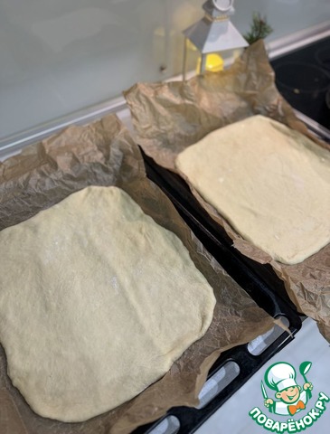 Разделить тесто на две части. Сформировать основы для пиццы. Выложить на противень, застеленный пергаментом