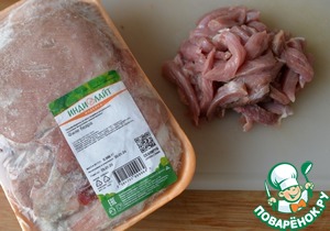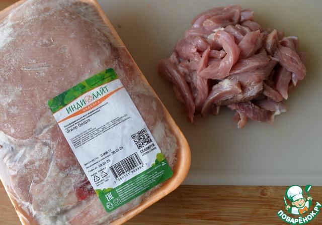 Для приготовления берём филе индейки. У меня - филе бедра индейки Индилайт. Режем индейку тонкими полосками.