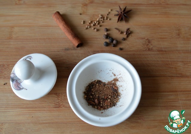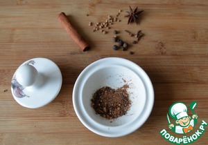 Берём все специи, измельчаем в ступке или иным способом. Не переусердствуйте со специями. В оригинале идёт сычуаньский перец и семена фенхеля, у меня этих специй нет, я нашла им замену.