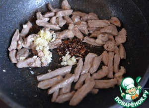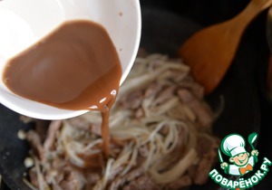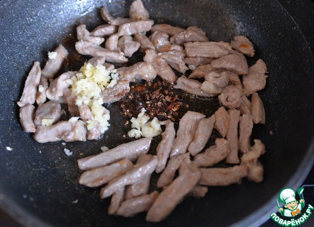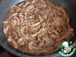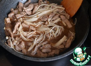 Перемешиваем. Тушим 3-4 минуты, грибы станут мягкими и похожими на лапшу.