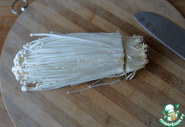 Берём грибы эноки. Отрезаем 2-3 см от корня.