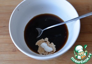 В миске соединяем воду, соевый соус, сахар и крахмал. Перемешиваем.