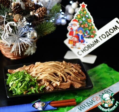 Хотите удивить своих гостей необычным блюдом на Новогоднем столе? Предлагаю приготовить индейку с грибами эноки. Ваши гости ни за что не угадают, что это. Потому что по внешнему виду эти грибы напоминают спагетти. Я живу на Дальнем Востоке, это блюдо появилось недавно у нас в китайских ресторанах. А вообще, эноки очень распространённый гриб в китайской, корейской и японской кухне. Если вы увидите у себя этот гриб в супермаркетах, не проходите мимо. У нас он в ассортименте (тонкие и толстые), и по цене ниже шампиньонов.