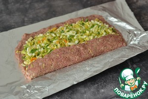 На фарш распределите равномерно начинку и прижмите аккуратно её ладонями к фаршу.
