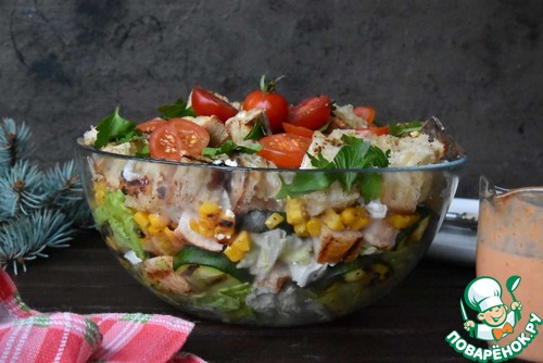 Предлагаю приготовить интересный салат с ароматом гриля. В нем соединились сочетания разных текстур и гамма вкусов. И все это разнообразие объединила пикантная заправка.