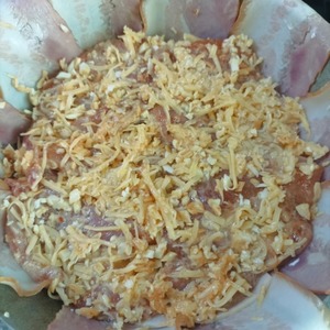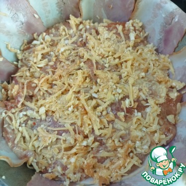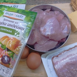 Сверху накрыть ветчиной и снова выложить куски индейки в панировке из сыра. Продолжить выкладывать слоями мясо и ветчину.