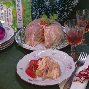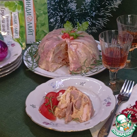 Рецепт из книги "Венгерская кухня" Харгитаи Дердь. Преимущество этого рецепта - возможность приготовить его заранее и подавать холодным в виде закуски или подогреть в микроволновке и подавать как горячее. Я использовала два вида мяса индейки - грудку и голень. Готовить можно в круглой форме диаметром 18 см и высотой 10 см. Я использовала маленький казан объемом 2 л.