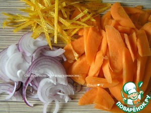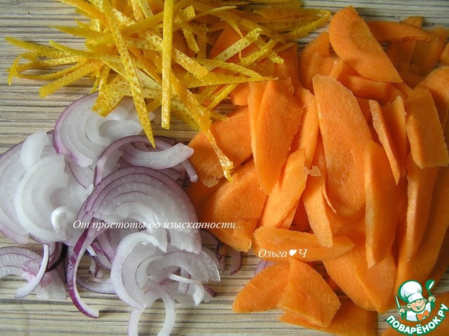 Цедру 2х апельсинов нарежьте полосками, лук - тонкими полукольцами, морковь - вдоль пополам и наискосок не слишком тонкими дольками.