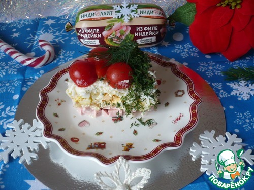 Можно много говорить о пользе овощных салатов, но как же хочется хотя бы за праздничным столом расслабиться и съесть вкусный салат с нежной вареной колбасой из филе индейки ТМ Индилайт, да еще заправленный майонезом. Угощайтесь!