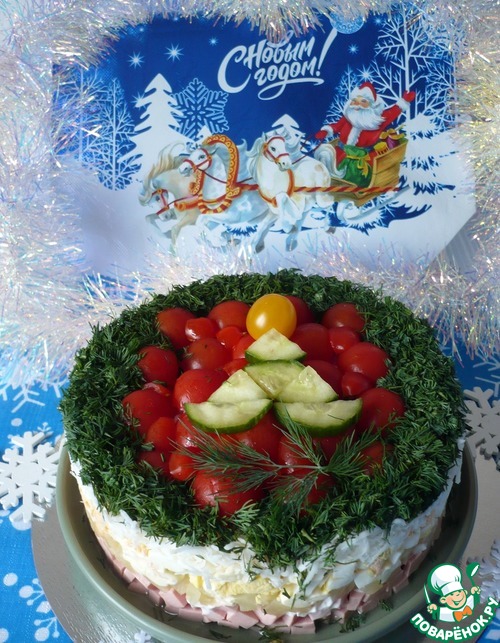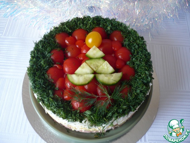 Чтобы салат выглядел празднично на Новогоднем столе я украсила его "елочкой"из нарезанных огурцов. Затем аккуратно снимите кольцо с салата и можно подавать к столу. Угощайтесь!