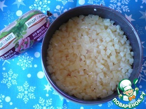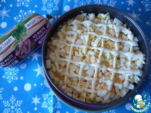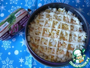 Консервированные ананасы (у меня кольцами), также нарезать мелкими кубиками, откинуть на сито (чтобы стек сок), а затем выложить вторым слоем. Сделать сеточку из майонеза.