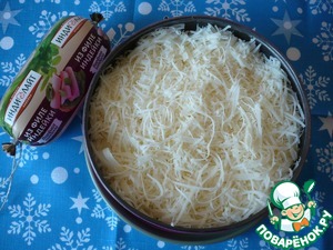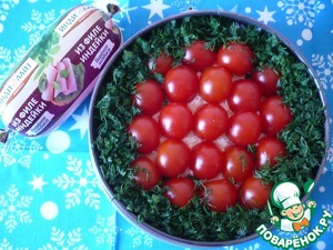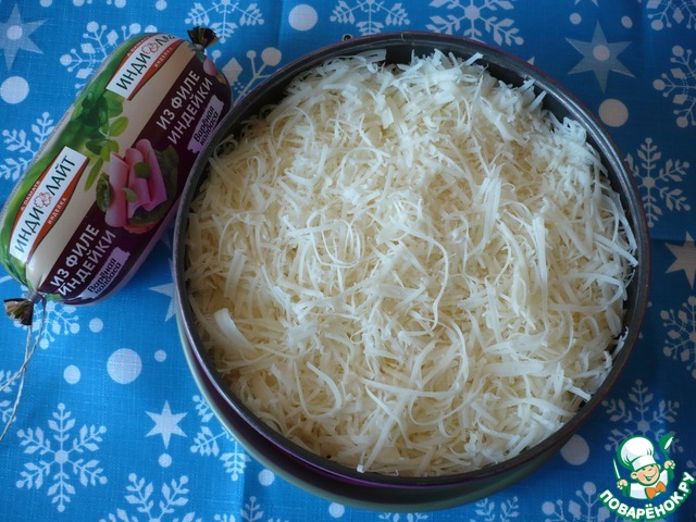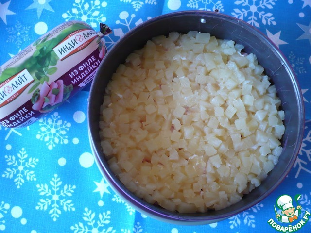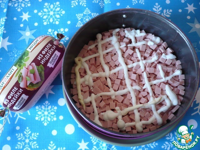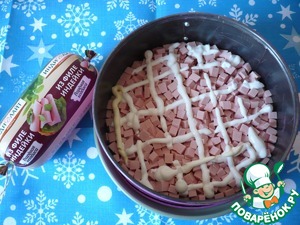 Салат я выкладывала слоями в разъемную форму для запекания (d-18 см). Установить её на плоское блюдо. Первым слоем выложить нарезанную вареную колбасу и сделать сеточку из майонеза.