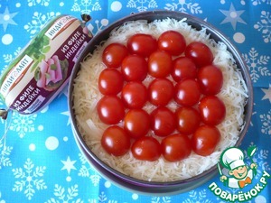 На слой натертого сыра я сразу выложила помидоры черри разрезанные на половинки, отступив немного от края.