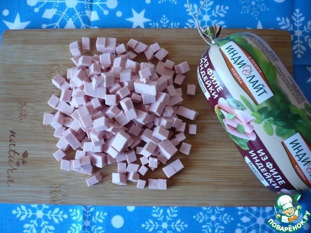 Для приготовления салата я взяла колбасу вареную из филе индейки ТМ Индилайт.