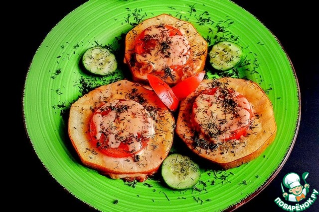 Подаём сразу закуску горячей. Сыр расплавился. Снимаем на красивую тарелку, присыпаем укропом. Украсить можно по-своему. Я украшу дольками огурца и помидора.