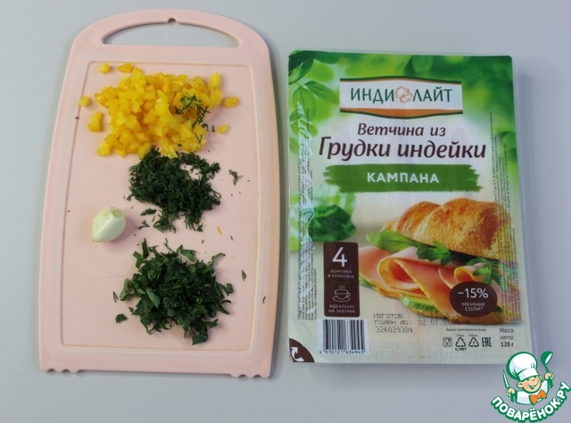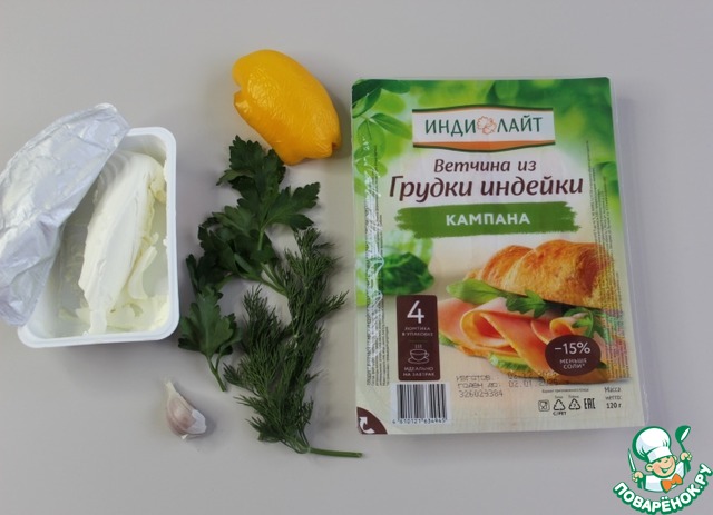 Ингредиенты для «Рулетики из ветчины с сырной начинкой»: