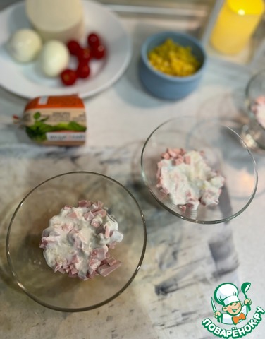 Собираем салат порционно в креманках. Первым слоем выкладываем ветчину нарезанную кубиком, добавляем немного йогуртовой заправки