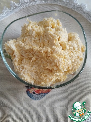 На мелкой тёрке натрите варёные яйца и плавленые сырки.