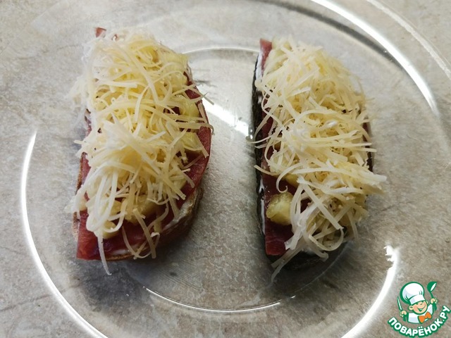 Отправить бутерброды в разогретую духовку (180 С) примерно на 7-8 минут, до расплавления сыра. Или можно в микроволновку. При подаче посыпать зеленью и горошинами розового перца.