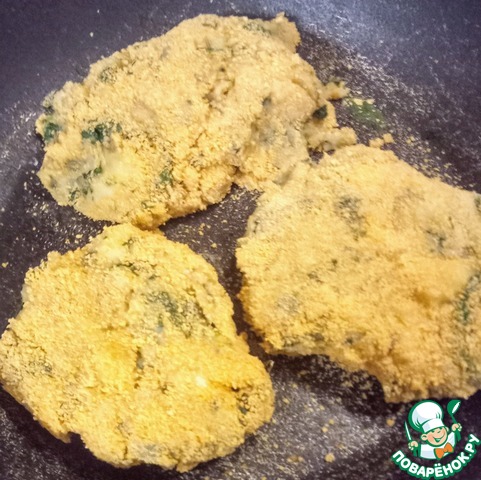 Слепить котлетки по 110г каждая. Обвалять в оставшихся сухарях. Отложить в сторону.