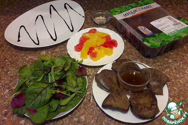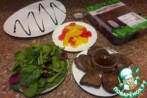 На подготовленную тарелку кладем горсть зелени с цитрусовыми фруктами. Сверху кусочки печени. Поливаем оставшейся заправкой, и посыпаем кунжутом.
