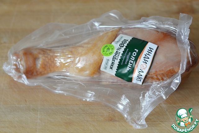 Для приготовления салата берём варено-копчёную голень индейки. У меня ТМ Индилайт.