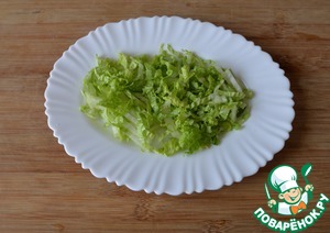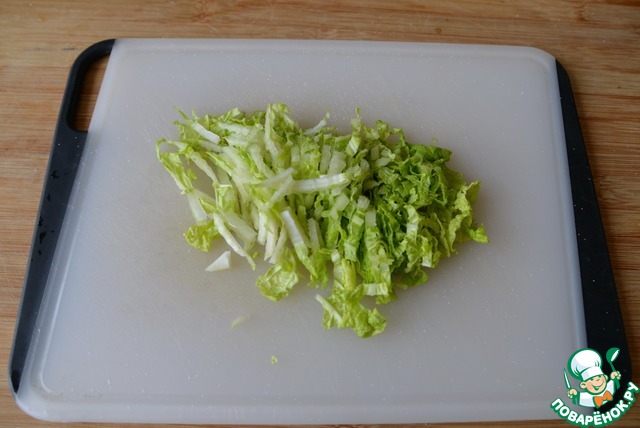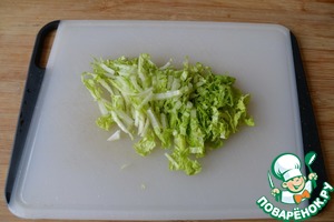 Берём пекинскую капусту, тонко шинкуем, солим, слегка обминаем.