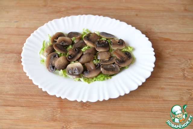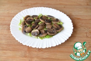 Берём половину указанного количества маринованных шампиньонов, режем пластинами, кладём сверху капусты.