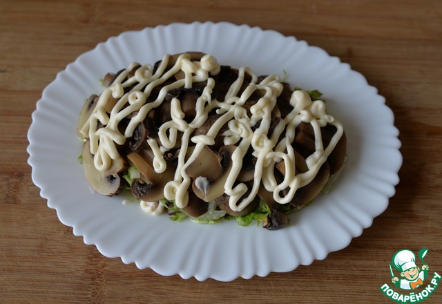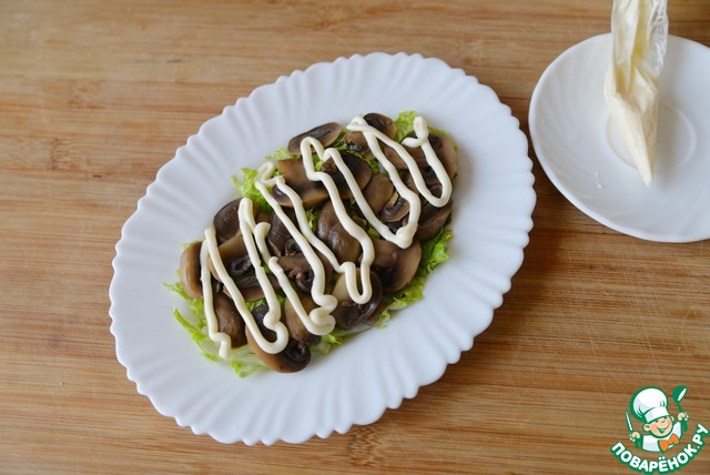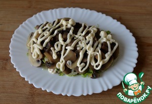 На капусту кладём оставшиеся порезанные маринованные шампиньоны. Наносим полоски майонеза.