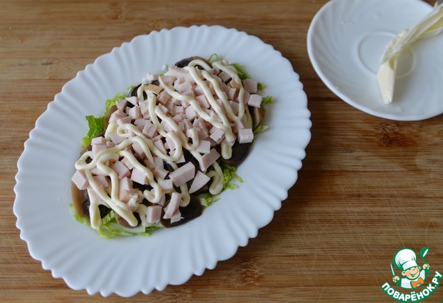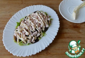 Кладём следующим слоем порезанную копчёную индейку, наносим полоски майонеза.