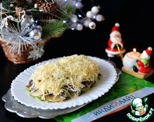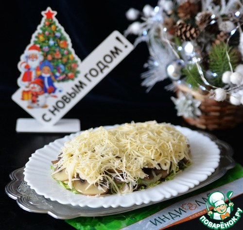 На мелкой тёрке трём сыр, посыпаем верхним слоем. Даём салату настояться минимум 2 часа. Подаём салат охлаждённым. Всего доброго в Новом году!