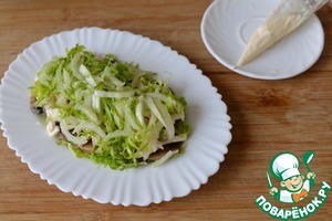 Следующим слоем кладём оставшуюся порезанную пекинскую капусту.