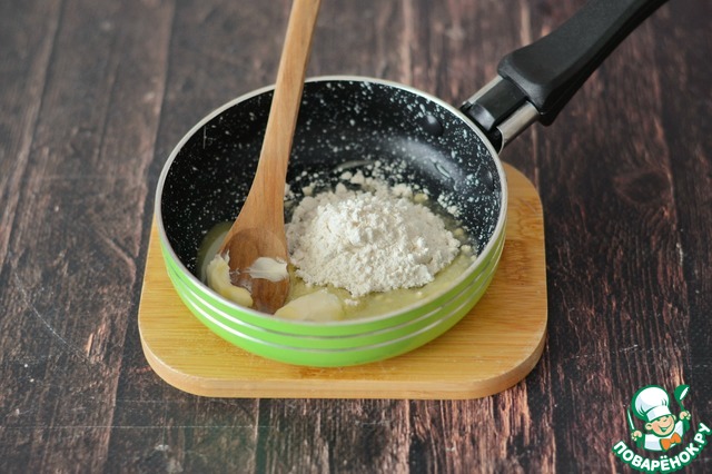 На смеси растительного и сливочного масел слегка поджарьте муку 10-15 секунд. Помешивайте лопаточкой, чтобы не подгорело.
