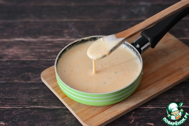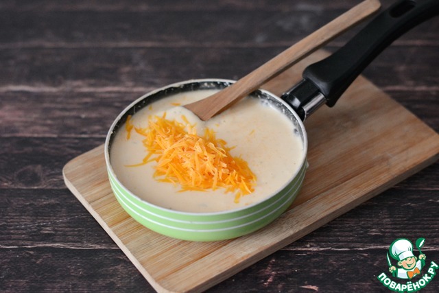 Затем добавьте в соус натёртый чеддер (или любой другой сыр с ярким вкусом).