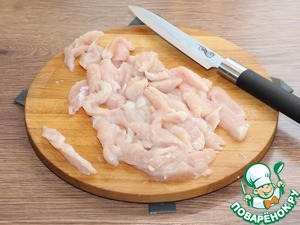 2. Филе индейки ополосните и просушите, нарежьте небольшими кусочками.