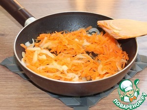 5. Обжарить на растительном масле 3-4 минуты репчатый лук. Затем добавить морковь и тушить минуты 3.