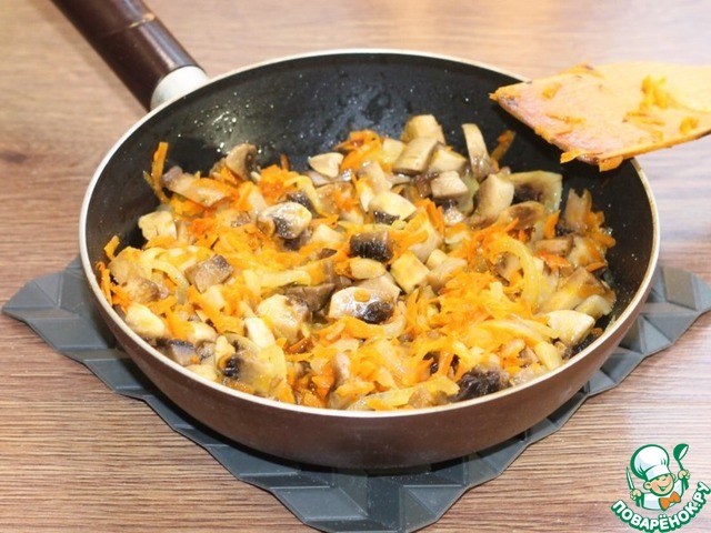 6. К зажарке добавляем шампиньоны. Обжариваем минут 5–6.