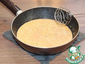 12. Приготовим соус. Расплавляем кусочек сливочного масла на разогретой сковороде. Добавляем сметану, томатный кетчуп и 100 мл воды, соль, перец и приправу. Перемешиваем венчиком и доводим соус до кипения.